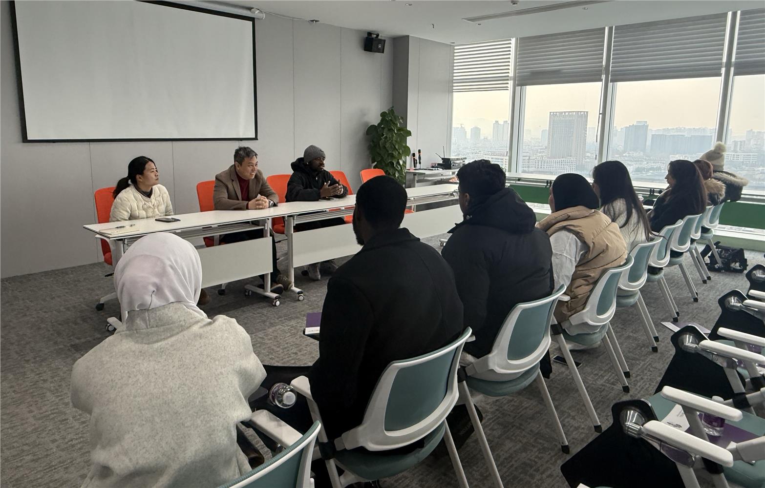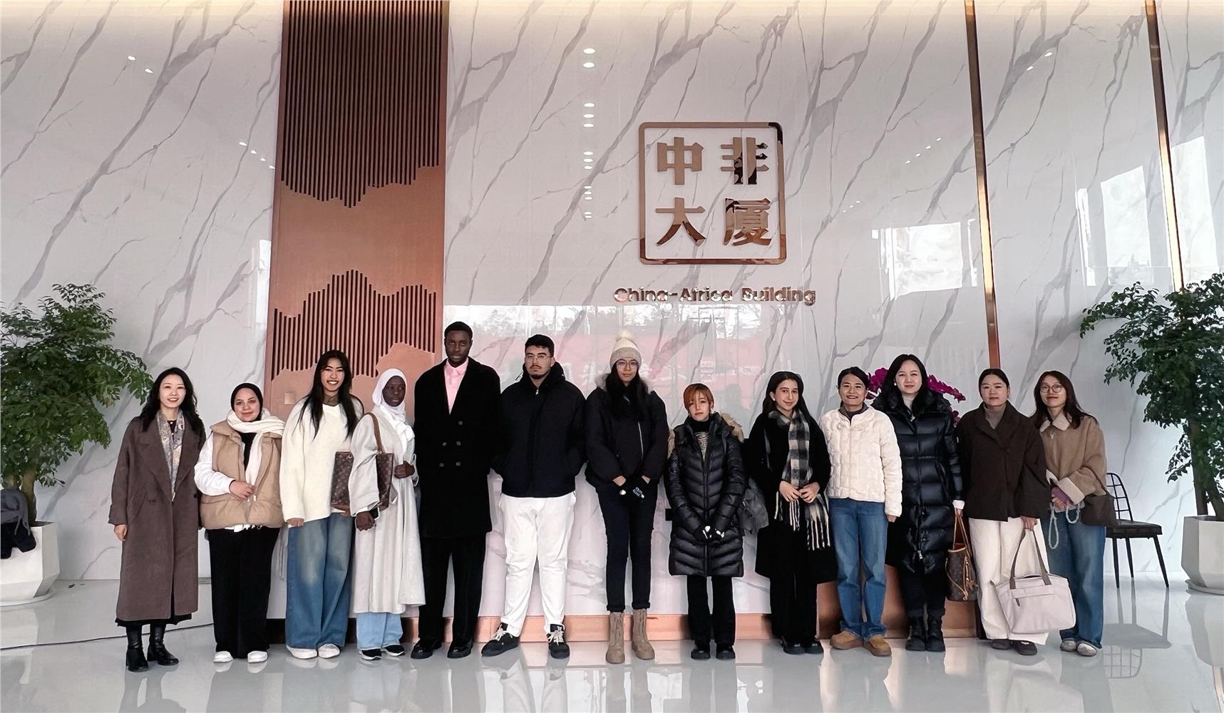 首站来到义乌市中非商会会长单位浙江对非控股集团,该集团是深耕非洲市场的大型综合性企业,业务覆盖电工电气、新能源汽车、对非投资与房地产四大核心板块,在30个非洲国家建立本地化运营团队,推动37个重点项目落地实施,旗下中非大厦作为“一站式”对非经贸服务枢纽,集成商品展示、投资对接等多元功能。参访团先后参观了其商品展区、中非投资合作对接区及非洲国家特色商品展示区,近距离了解YAKI新能源电工电气设备等出口主力产品,以及非洲特色农产品、手工艺品的进口贸易情况,直观感受中非经贸合作的蓬勃态势。义乌市中非商会会长、浙江对非控股集团总裁朱舜与师生们亲切座谈,围绕对非贸易分享行业经验,针对学生实习岗位的专业能力、语言素养及实践要求提出具体建议,为校企协同培养专业化、国际化高技能人才指明方向。